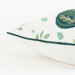 This hand screen printed pillow features machine embroidered accents. Gold foil printed botanicals accent the pumpkin as well as the leaves and berries. Festive and glammed, this pillow is a beautiful adornment for any transitional décor. A contrasting welt in the same teal frames this pillow. A back in a solid matching cotton features a hidden zipper closure.