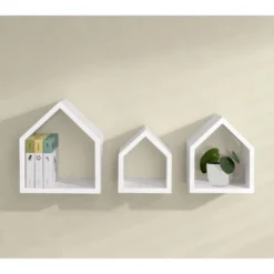 The unique White Dolle Lodge Set Floating Wall Shelves is a sweet display of 3 angled side cubes that are the perfect home for your most dear items, small items or an ideal small storage space in any room of your home or office. The different sizes can be mounted at various height to acheive a particular desired design appearance. The cottage shelf is handmade and finished in a matte white paint by hand. Mounting hardware is included with this shelf.