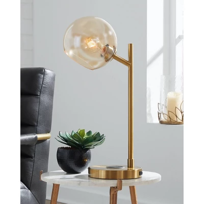 The added functionality of this desk lamp was smartly designed to shine light where you need it most without compromising style. Featuring a wireless charging pad and 1 USB charging port, you can charge up without cords or clutter. The glass shade brings a fresh take on this design making it the ideal lamp for your living room, reading nook or office. Brushed gold finished metal desk lamp. Glass shade. (1)Wireless charger and (1) USB charging port. On/off switch. (1) E26 socket, type A bulb recommended – 40 watts max or 8 watts max CFL. Matching Floor Lamp L206021. Signature Design by Ashley is a registered trademark of Ashley Furniture Industries, Inc.