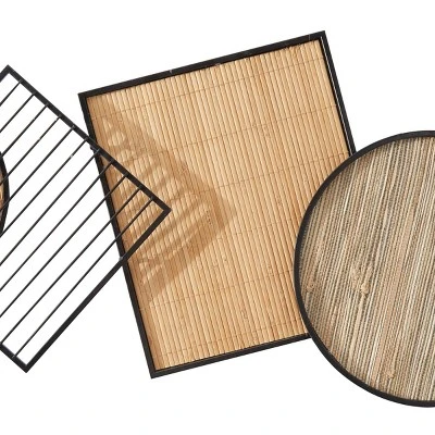 - Highlights a 3D display of overlapping geometric shapes filled with bamboo strips alternated by metal mesh