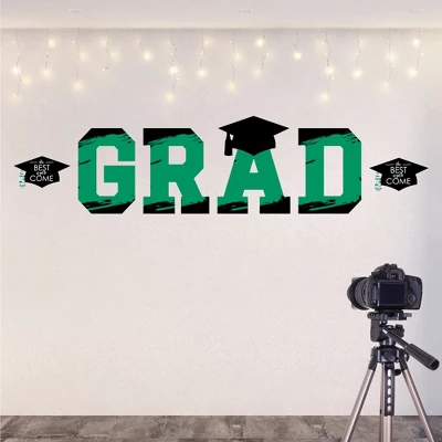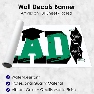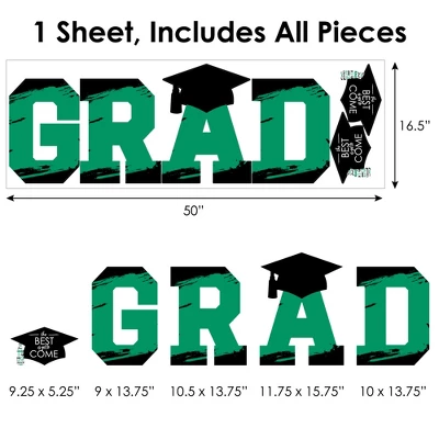 Green Grad – Best is Yet to Come Standard Banner Wall Decals include 1 sheet of vinyl sticker letters that spell “Grad” and 2 grad cap shapes that will look great as part of your Graduation Party decorations. Wall Decal sheet measures 50 inches wide by 16.5 inches tall. Pieces range in size from 11.75 x 15.75 inches to 9.25 x 5.25 inches. Effortless Decor: Hang the Green Grad – Best is Yet to Come letters next to each other to form a party banner. They can be hung vertically or horizontally and will add some extra charm to your party space within minutes! Use the wall decal banner at your entryway, over the food table, or on a photo booth backdrop. Easy to Use: Green Grad – Best is Yet to Come vinyl decals are easy-to-peel and repositionable. Wall art stickers will adhere to various surfaces including painted walls, plastic, wood, glass, and metal. To use, make sure your surface is clean and dry. Slowly peel the sticker from the paper to avoid tearing and smooth over with your hand. They are also easy to remove, leaving no residue. High-Quality Supply: Green Grad – Best is Yet to Come wall stickers come with a quality matte finish and vibrant colors. They are printed on water-resistant professional quality material and will arrive on one full sheet rolled. Made In The USA: Green Grad – Best is Yet to Come Wall Decals are designed and manufactured at our Wisconsin facility using materials that are Made in the USA.