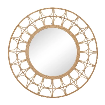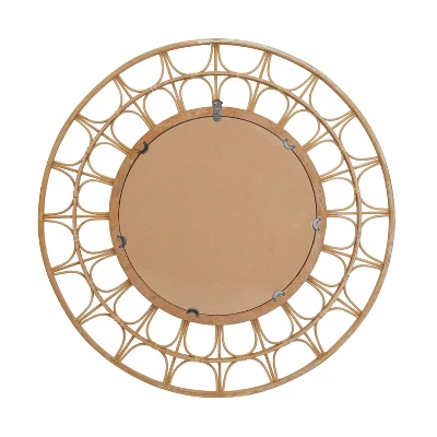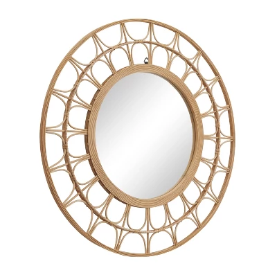 - •Wall mirror for decor featuring a round reflective glass panel and a brown natural bamboo frame with a geometric pattern