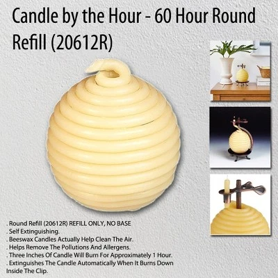 Candle by the Hour round candle refill is easy to use and lasts hours upon hours. Merely place the beeswax coil through the spring loaded clip in increments of 3 inches or less. Each three inches of candle wax will burn approximately one hour. This product is only used as a refill.Experience the warm glow of Candle by the Hour 60-Hour Round Candle Refill, crafted from all-natural beeswax with a cotton wick. This eco-friendly refill fits perfectly in the round candle holder and burns for up to 60 hours, providing a natural ambiance to any setting.