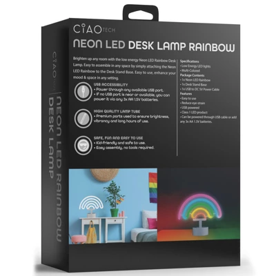 Introducing the NEON LED DESK LAMP – Rainbow, a colorful and captivating lighting accessory. This lamp features low-energy LED lights that create a vibrant rainbow glow. The package includes a Neon LED Rainbow, a desk stand base, and a USB to DC 5V power cable. With its easy-to-use design, it reduces eye strain and is classified as a Class 1 LED product. The lamp can be powered through the USB cable or by adding three AA 1.5V batteries. Add a touch of whimsy and color to your desk or room with this mesmerizing rainbow neon desk lamp.