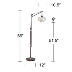 - Bronze finish metal base with antique brass accents over metal construction. See-thru cognac tinted glass. Non-adjustable top arm.