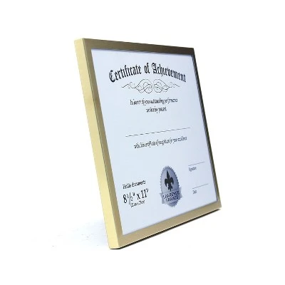 The Lawrence Frames 240281 8.5″ x 11″ Aluminum Gold Document Frame can be wall-mounted to conveniently display your photos and features a gold finish for enhanced appeal. Designed to display your favorite photographs, the Lawrence Frames Rectangular Document Frame with its stylish design and sturdy construction makes a perfect home decor accessory. Made of aluminum with a gold finish, it ensures strength and durability. Featuring a sleek, single-frame design, you can use the document frame to showcase your prized memories. Horizontal or vertical document frame to showcase your favorite photographs. Can display photos measuring 8.5″ x 11″ (without mat). Dimensions: 11.2″H x 8.8″W. Aluminum construction for enhanced visual appeal and long-lasting use. Classic single-frame design complements any decor. Can be conveniently mounted on the wall for easy viewing. Sold as 1 Each.