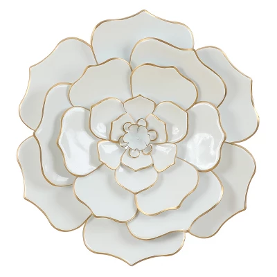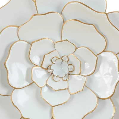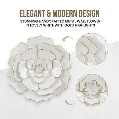 Bring the garden to your room with this chic, artfully glossy white wall flower that creates a dose of flower power to your space. The blooming flower almost looks like its unfolding in front of your eyes. Artistically crafted from metal, the brilliant white petals are lined with gold that give this piece a stunning effect that will be a joyful element to your decor. Display this elegant flower in your bedroom, living room, kitchen, or entryway! A classic and timeless style of design for your traditional setting home.
