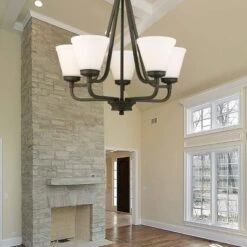 The Mayview Five Light Chandelier by Eglo will make a striking addition to your home. Constructed from durable metal, it features a striking matte bronze finish. A quintet of upturned frosted glass shades completes the look, producing a warm and inviting glow. Versatile and appealing, the transitional design is ideally suited to a wide variety of interiors.