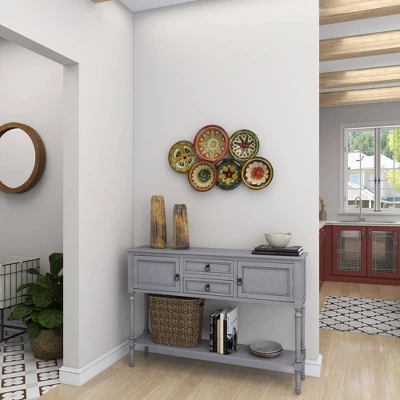 - •Multicolor metal wall design flaunting round plates with floral patterns