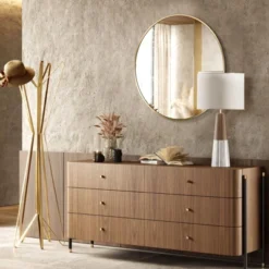 This mirror features an round shape silhouette at the Aluminium frame that complements most styles and color schemes. The frame is made of brushed gold metal with an angled design to protect the mirror. Besides, the gold mirror is anti-stripping, anti-cracking and anti-water,and it is safer and more premium than traditional recessed frames.Round Mirror is made of 4 mm high quality copper free mirror, an effectively prevent deformation blurriness, can achieved more than 95% reflectivity within 5 meters, High reflectivity resulting in Ultra HD, Distortion-free imaging, with 2mm moisture-proof density,when the lens is broken, slag should be firmly fixed with dense fiberboard, slag will not splash and hurt the user. The well-designed packaging ensures that the rounded corner mirror is delivered safely.