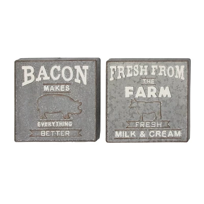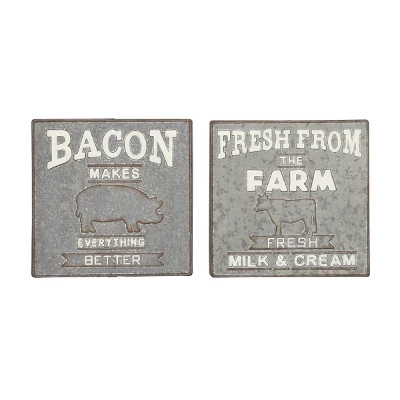 This set of farmhouse wall decor can help set an inviting atmosphere in your kitchen or dining room. Made of solid iron, the two square signs display country themed images and text. This item comes shipped in one carton. Items come with metal loop for easy and secure hang. Suitable for indoor use only. This set includes 2 wall Decor. One sign has a silhouette of a pig and reads, “Bacon makes everything better.” The other features a cow and reads, “Fresh from the farm. Fresh milk & cream.”. Farmhouse-themed style.