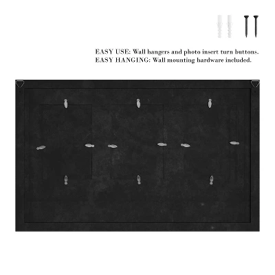 - EASY HANGING- No assembly required! This photo collage frame has hanging hooks and already comes with screws and drywall anchors for easy wall mounting. Simply use turn buttons to open back to insert photos or artwork.